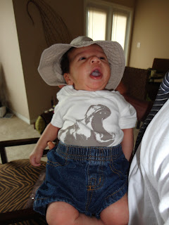 I love this cute little outfit-it's still too big, but I had to put it on him before it was too warm. Notice how dark his skin is getting? ;)